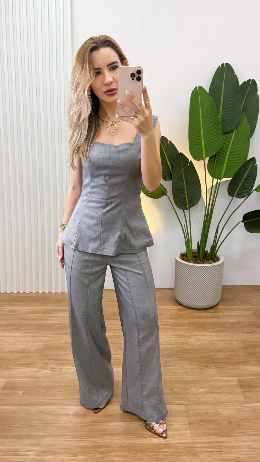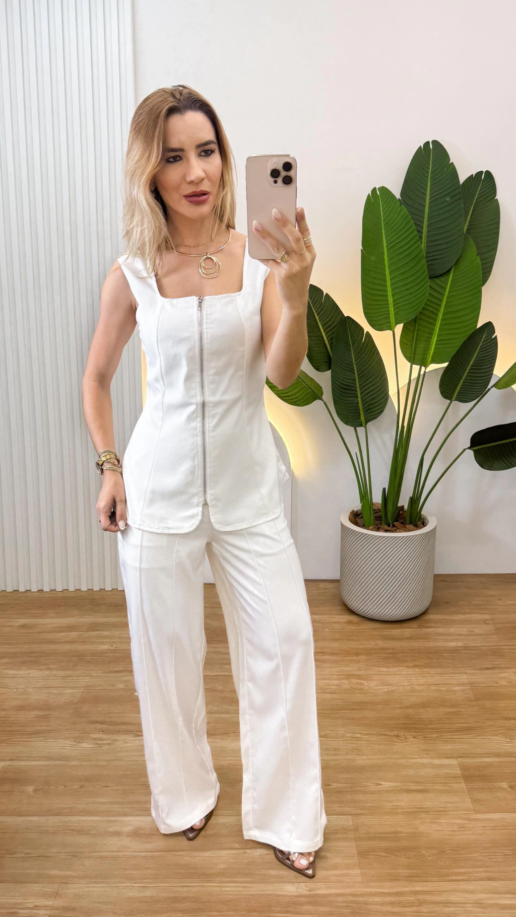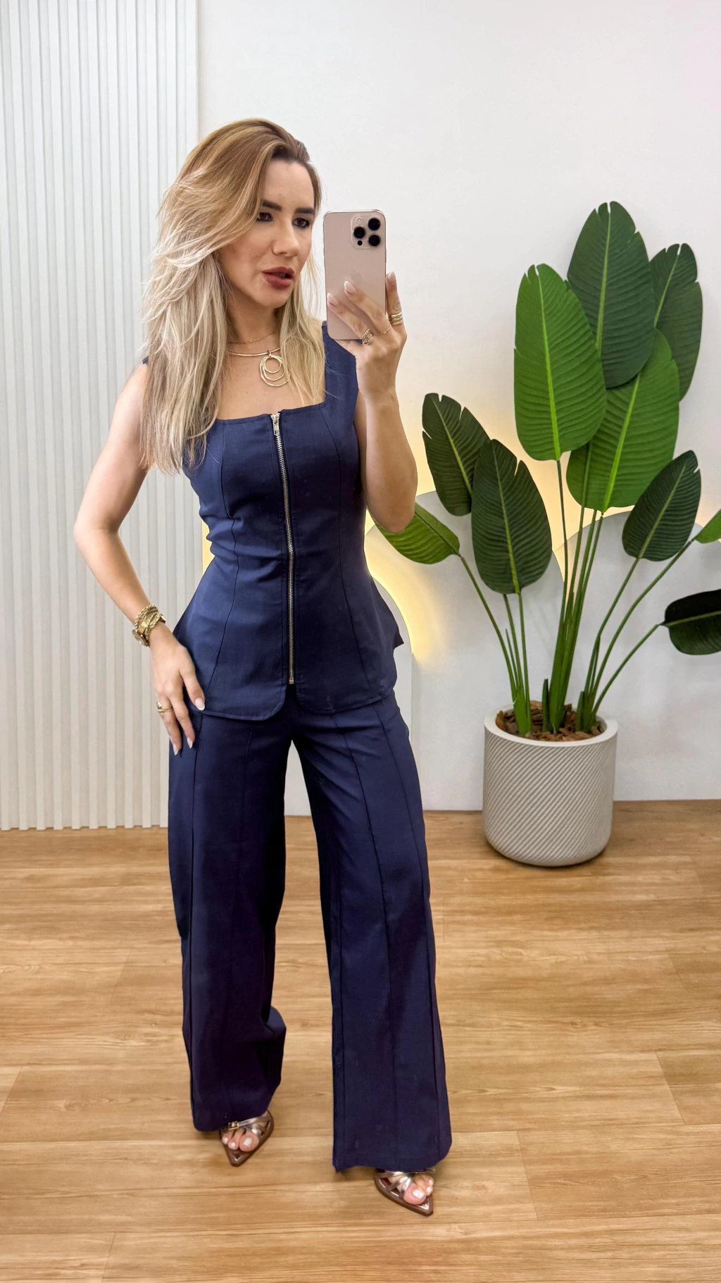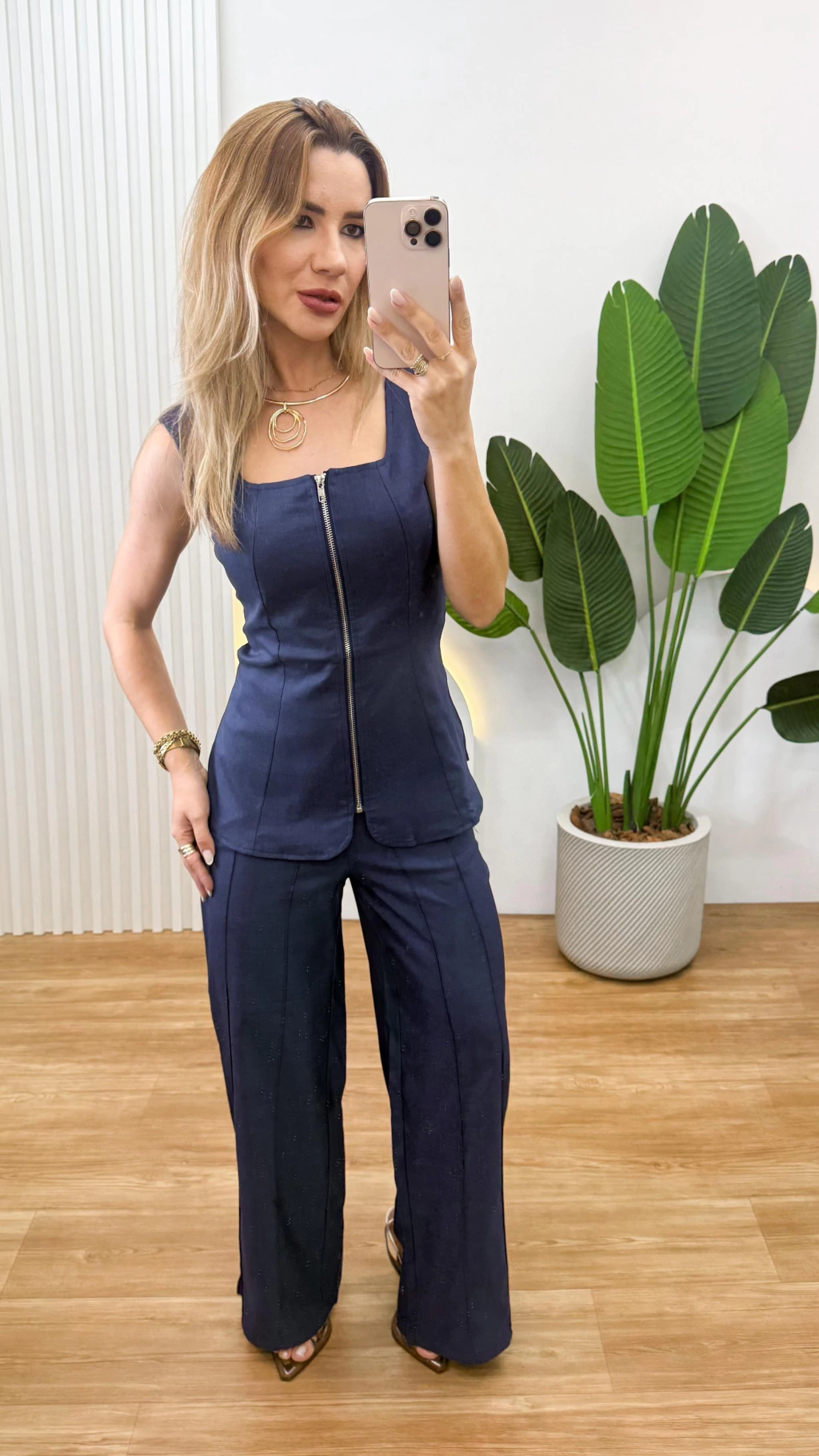 • Calça: Zíper posterior, bolsos na frente e modelo pantalona.