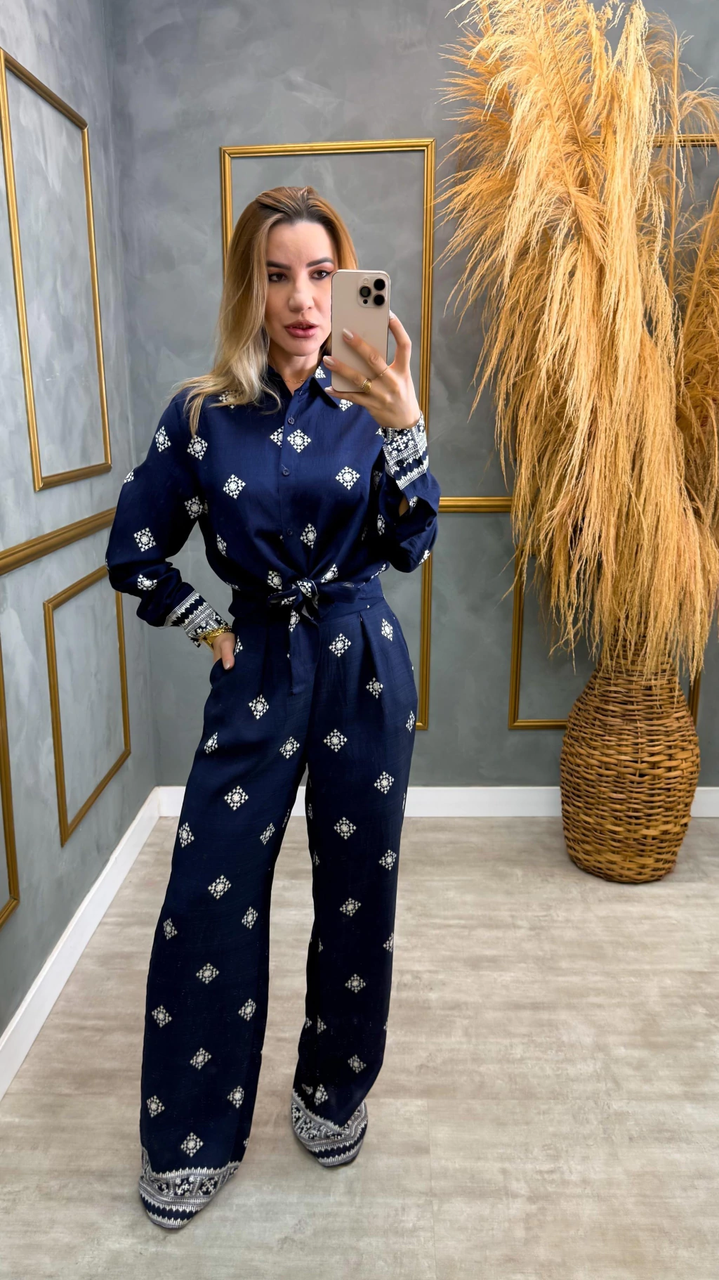 • Calça: Lastex no cos, bolsos na frente, modelo pantalona.